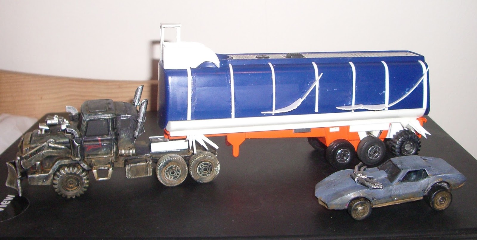 Again, this is just a plasticard job. The car on the right is a Matchbox or Hot Wheels car, so you can see the scale. It's hard to make out in this picture, but there's a plasticard superstructure on the front of the trailer, which is supposed to look like half a VW Beetle, as per the film. I went for a blue-black colour rather than straight black.